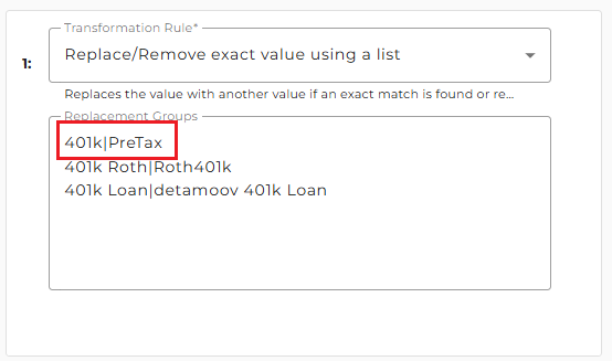 Example: detamoov receives a value in the Pre Tax deduction field and converts it to 401k. A transformation is then performed to convert 401k to the UKG code. By default, this value would be 401k. If your client's deduction code is different in UKG, say your UKG deduction code is PreTax instead of 401k, then you will need to provide a transformation override for the Deduction Code field.