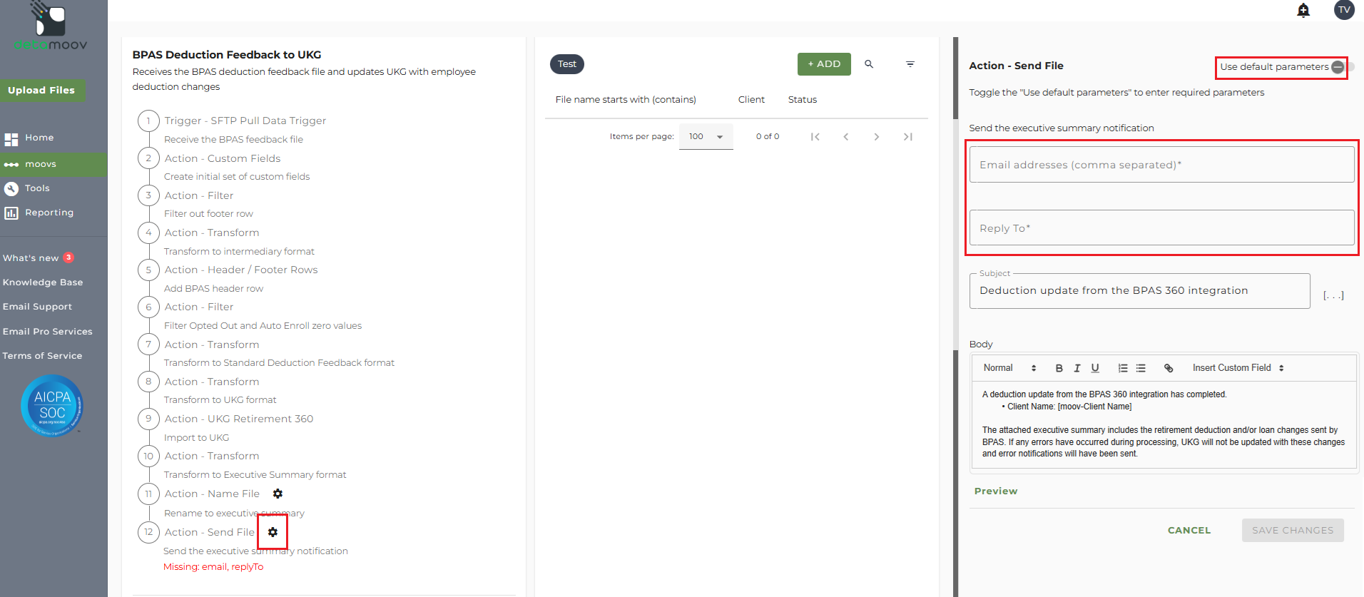 Note: these settings apply to any client configuration you set up for this specific moov. You also have the ability to configure the send file step for each client configuration if you wish to add or remove email addresses per client.