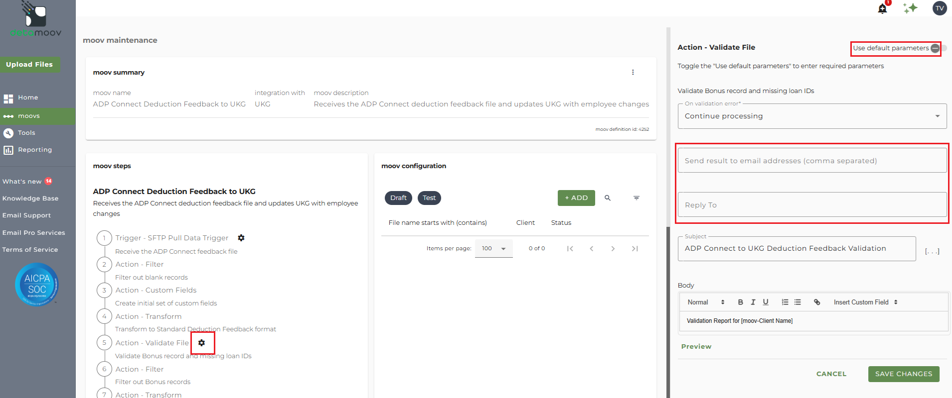 To ensure that you receive the notification, configure the Validation step and provide an email address and reply to address. To edit the validate file step, click on the cog icon under the Action - Validate Files step on the left. Then toggle the "Use default parameters" off and enter in the email addresses you would like to receive the notification. If you would like to enter multiple email addresses, separate them with a comma. A Reply to email is also required in the event that a recipient of the notification replies to the email.