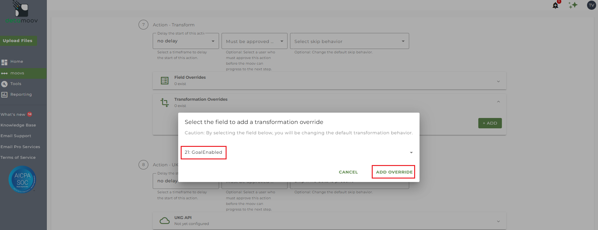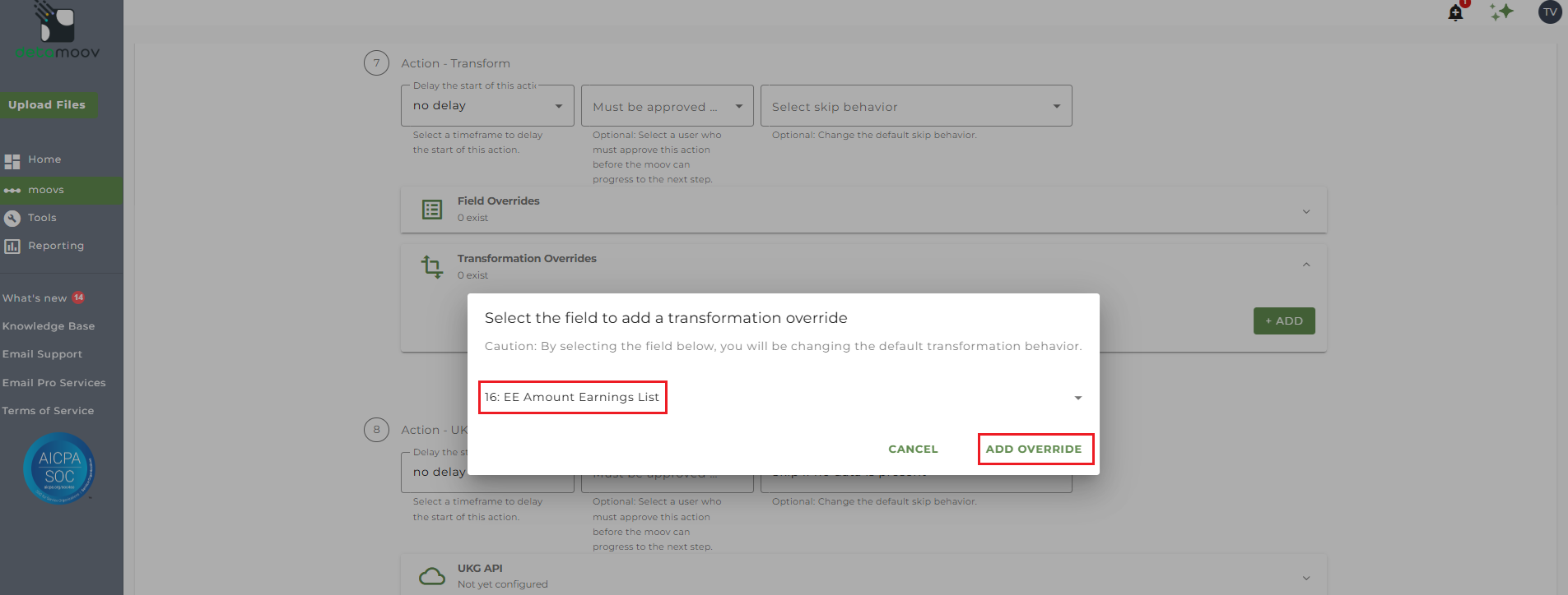 Note: The ADP Connect Deduction Feedback to UKG moov contains three separate Transform steps. The following information relates to step 7: Action - Transform only.