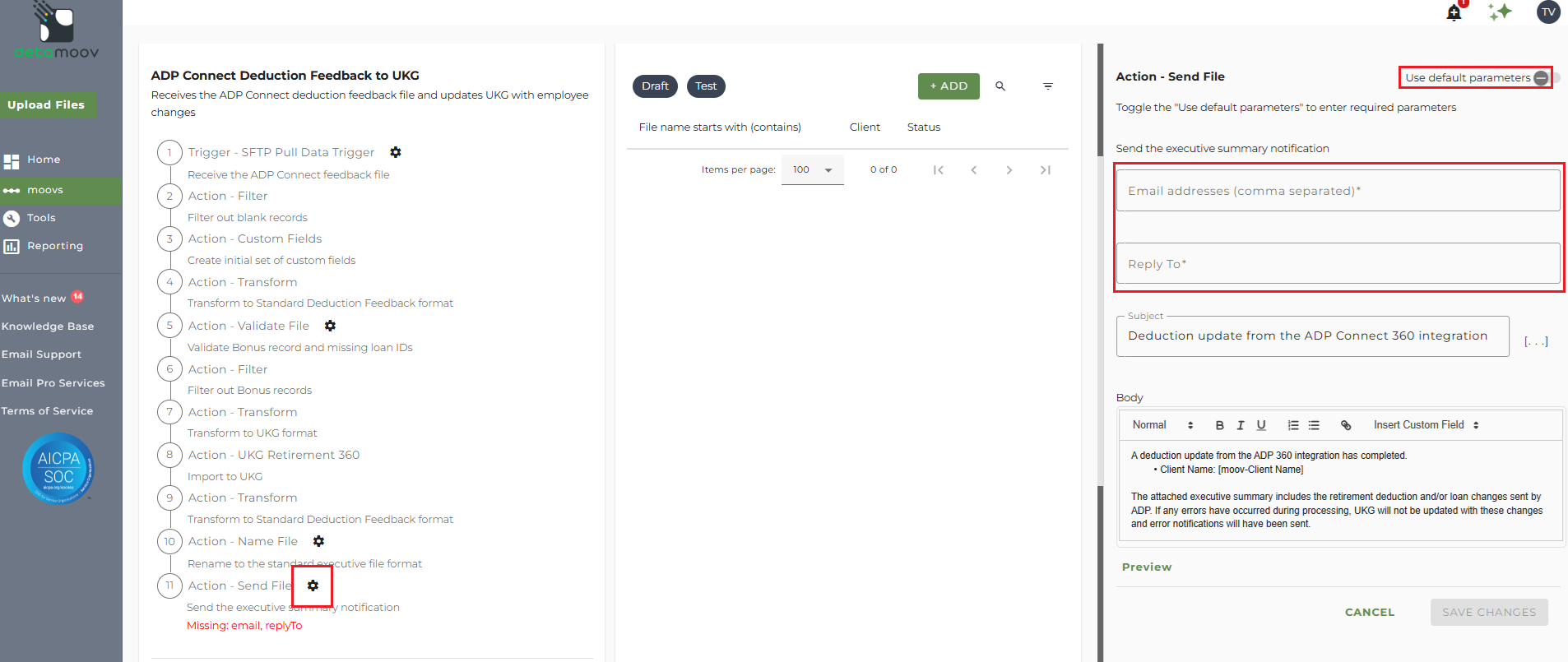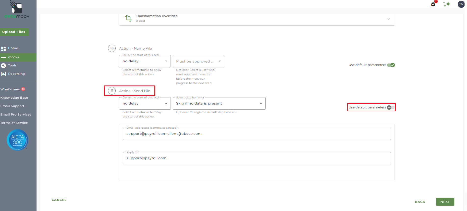 Note: these settings apply to any client configuration you set up for this specific moov. You also have the ability to configure the send file step for each client configuration if you wish to add or remove email addresses per client.