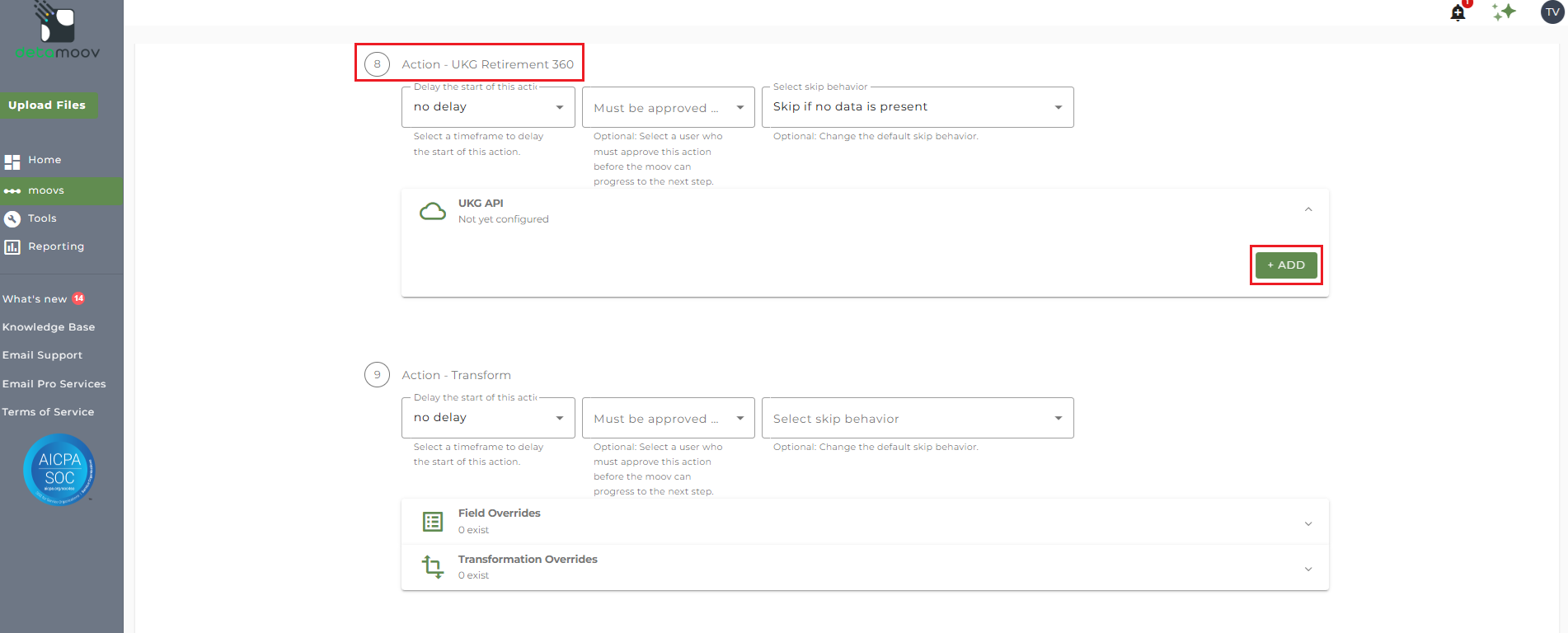 To configure the UKG Retirement 360 step for you client, locate the Action - UKG Retirement 360 step, expand the UKG API panel and click ADD.