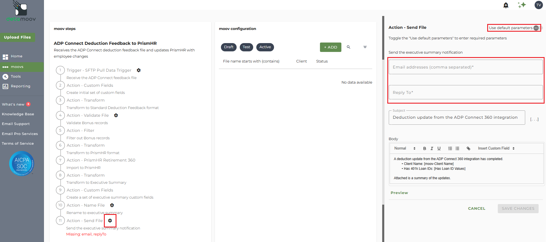 The ADP Connect Deduction Feedback to PrismHR moov provides a notification once the moov is complete with a summary of the retirement plan and loan changes that were made in PrismHR. The notification can be sent to any email address you wish and can also be configured to send to multiple email addresses.