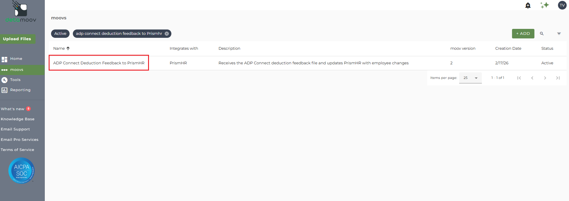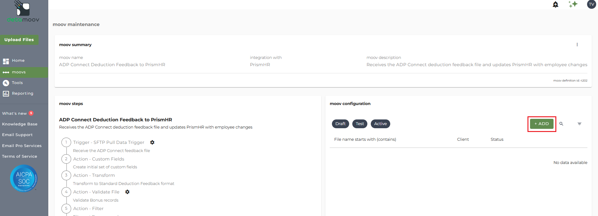 Once the ADP Connect Deduction Feedback to PrismHR moov has been added to your account, access the moovs section on the left side menu and click on the ADP Connect Deduction Feedback to PrismHR moov.