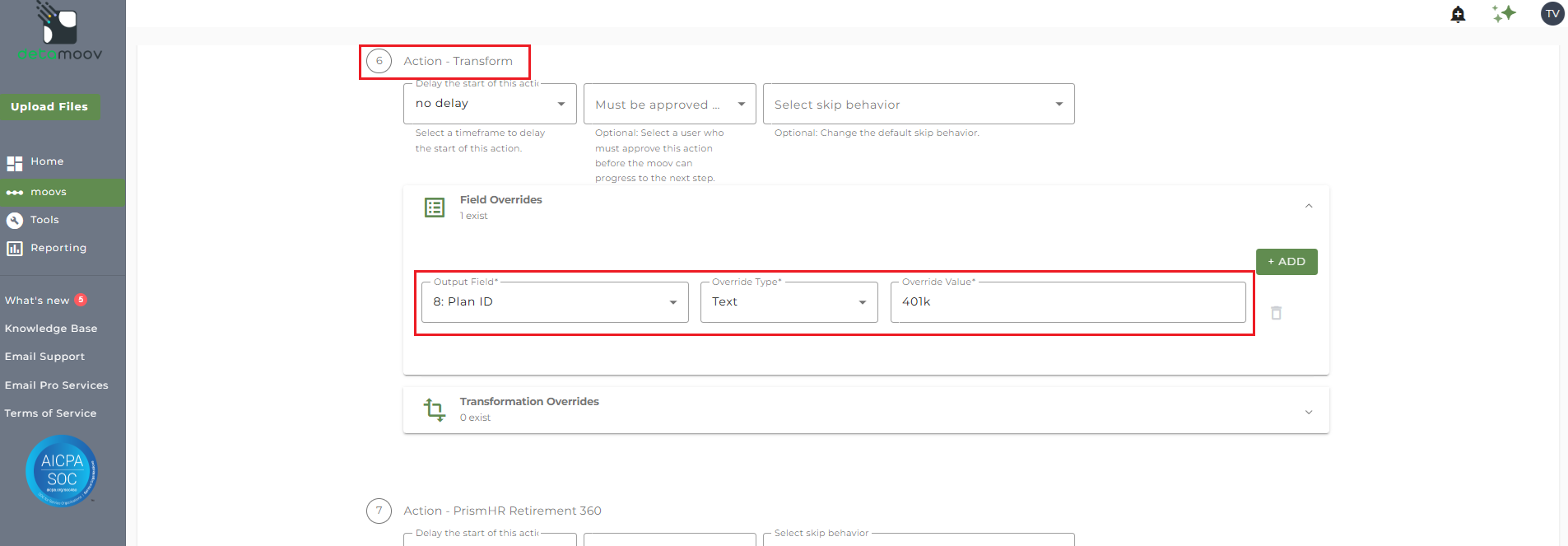 The PrismHR Plan ID is required for detamoov to update changes via their API. A field override is required to provide this as the Plan ID in ADP may be different from the Plan ID in PrismHR.