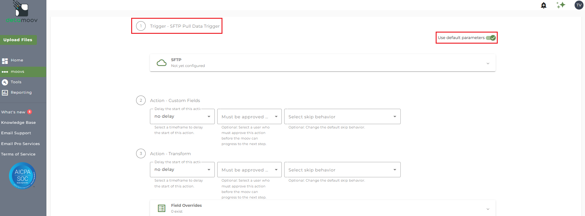 To override the SFTP credentials, locate step 1: Trigger - SFTP Pull Data Trigger and toggle the "Use default parameters" off.