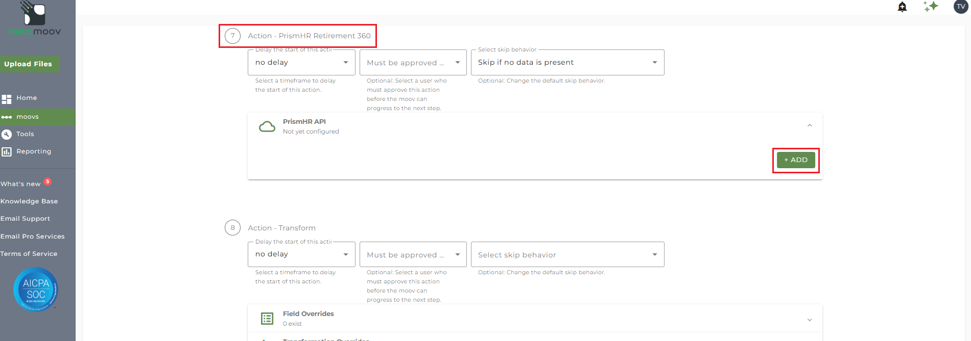 To configure the PrismHR Retirement 360 step for you client, locate the Action - PrismHR Retirement 360 step, expand the PrismHR API panel and click ADD.