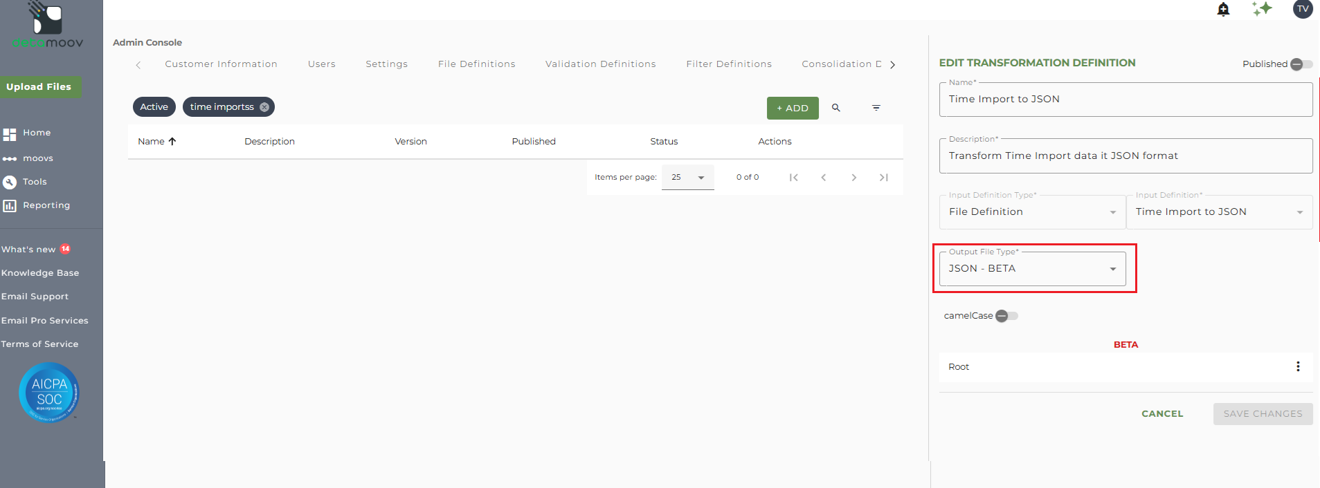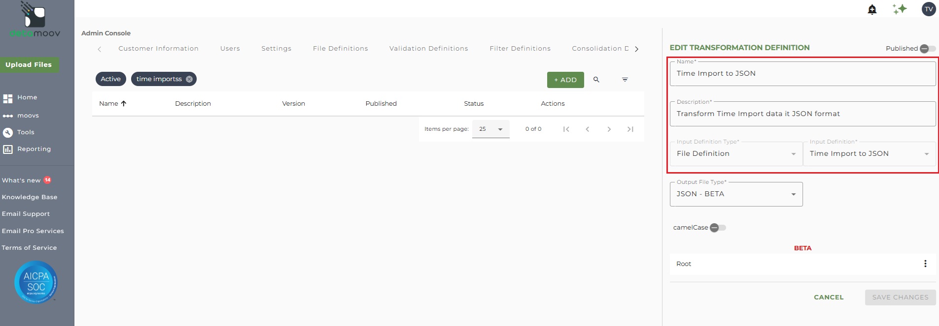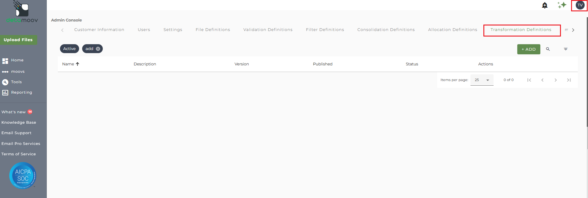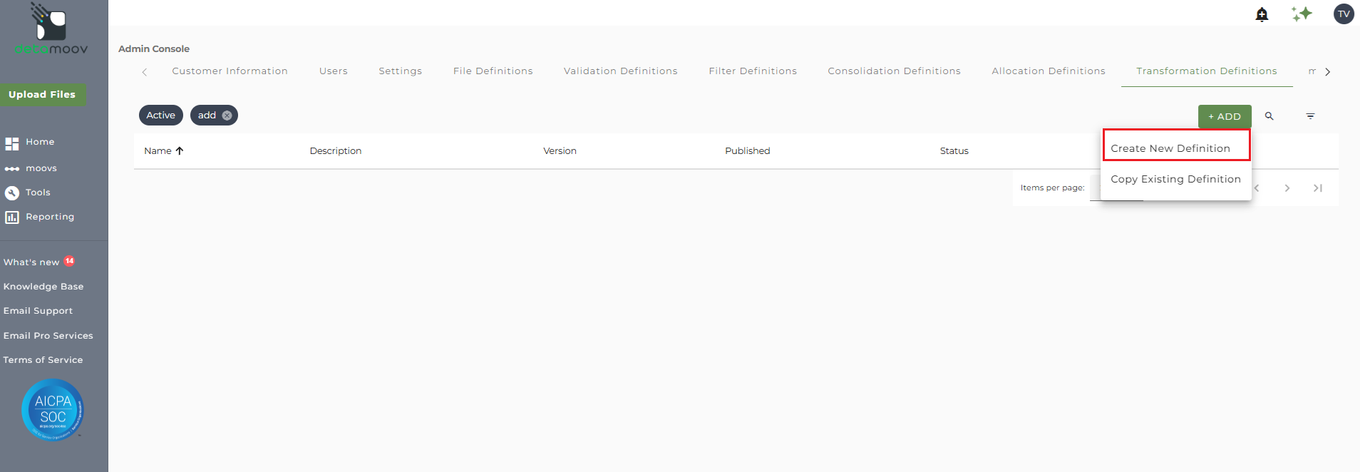 To create a new transformation definition, access the Admin Console by clicking on your initials at the top right hand corner and then click the Transformation Definitions tab.