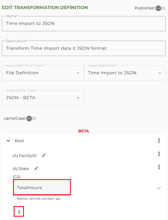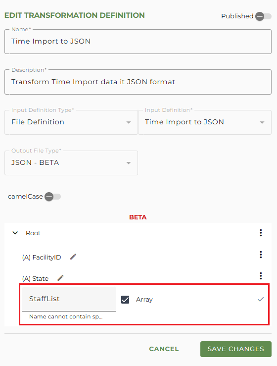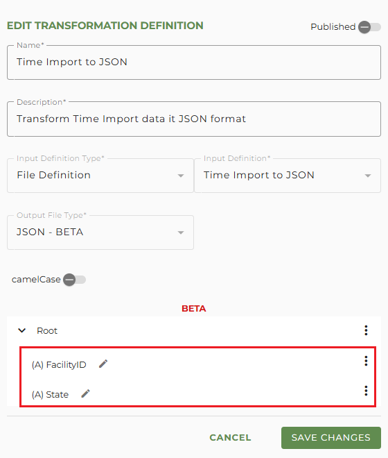 At any time during the creation of the transformation definition, you can save your changes and use the preview function to review the JSON format.