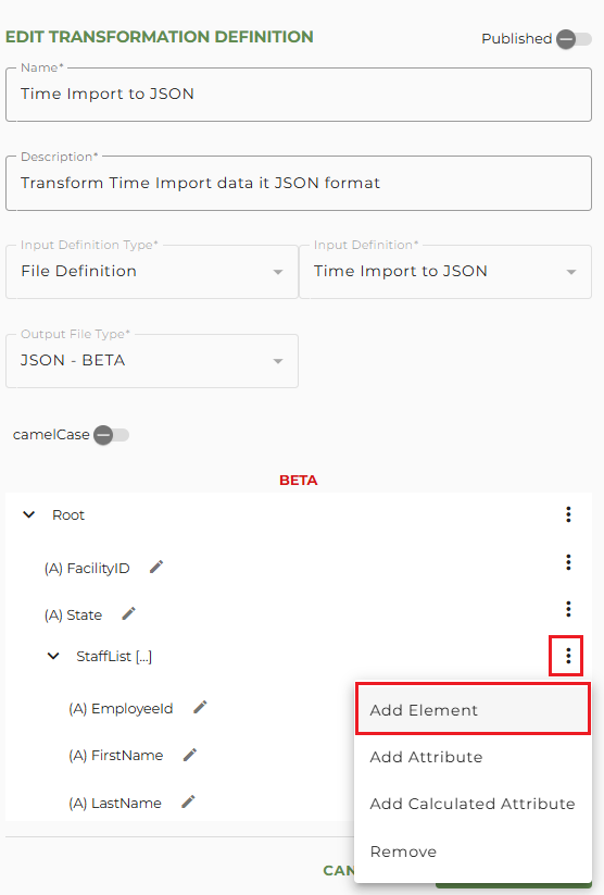 To create the attributes for the StaffList element, click on the vertical dot menu for the StaffList element and select Add Attribute.