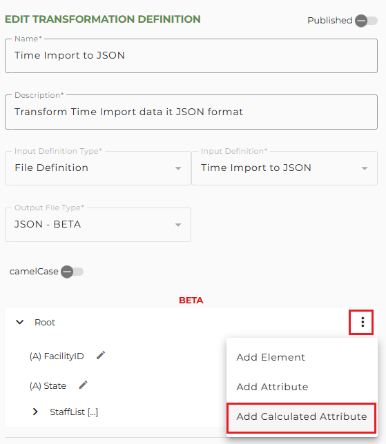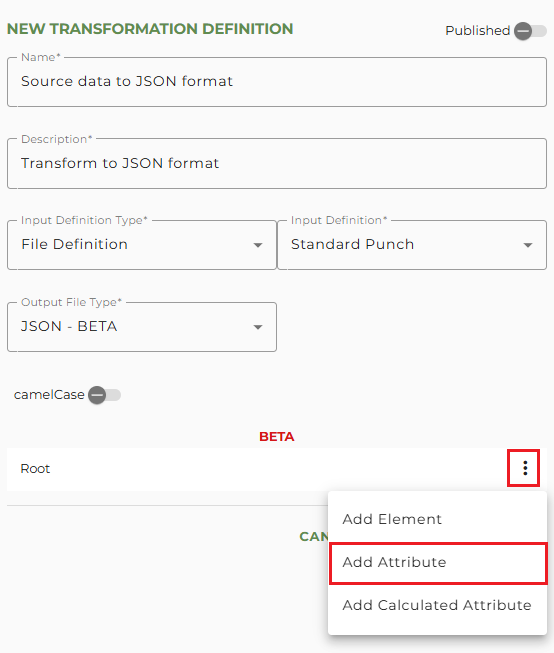 To add a Calculated Attribute to the Root, click on the vertical dot menu and select Add Calculated Attribute.