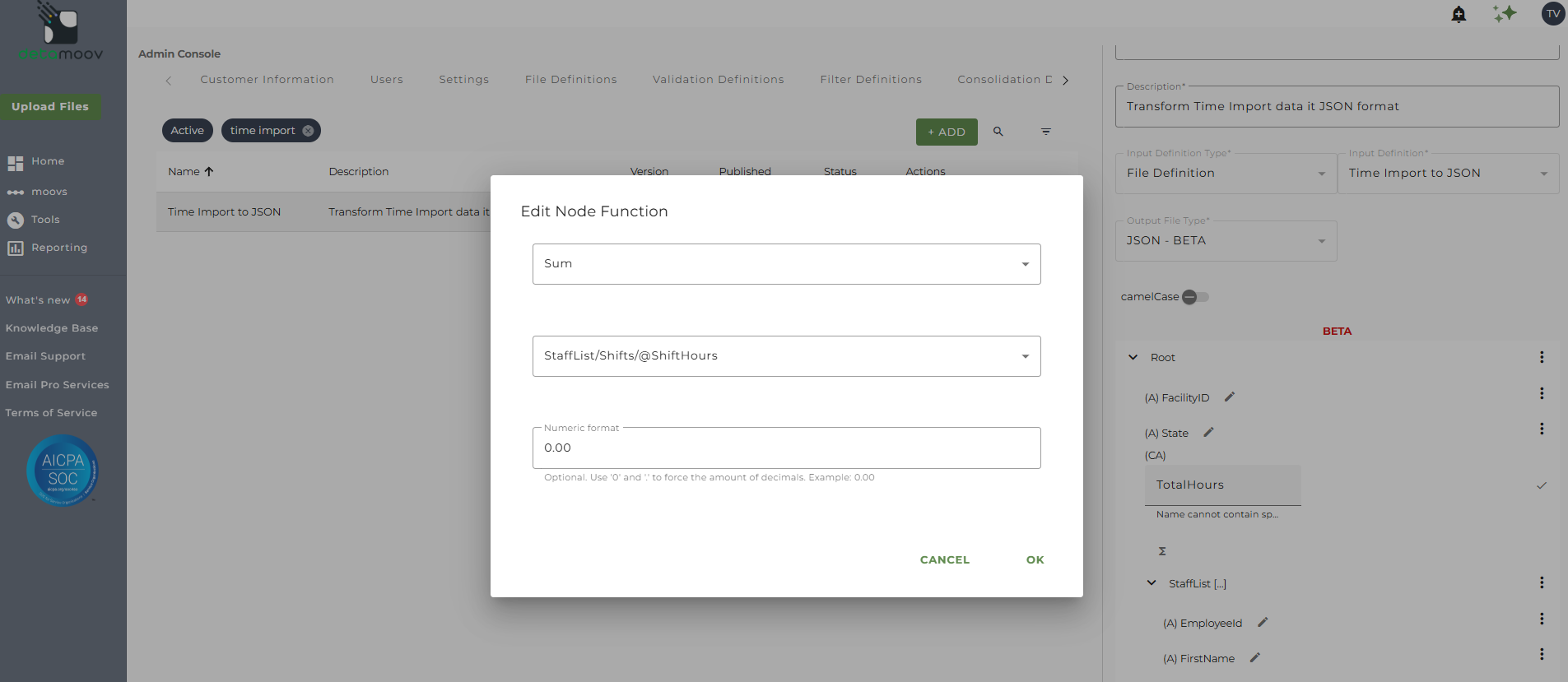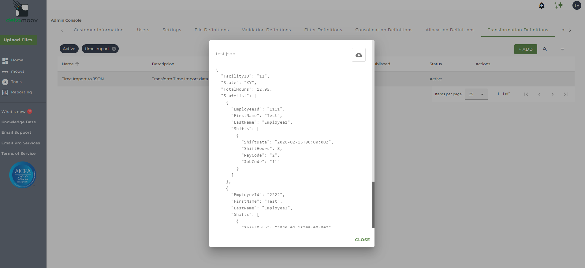 This article describes how to create a Transformation definition that generates a JSON format as the output. JSON (JavaScript Object Notation) is a human-readable, machine parsable text-based format for storing and exchanging data. It is commonly used in web development and can be used in a moov definition to communicate with a third-party API.