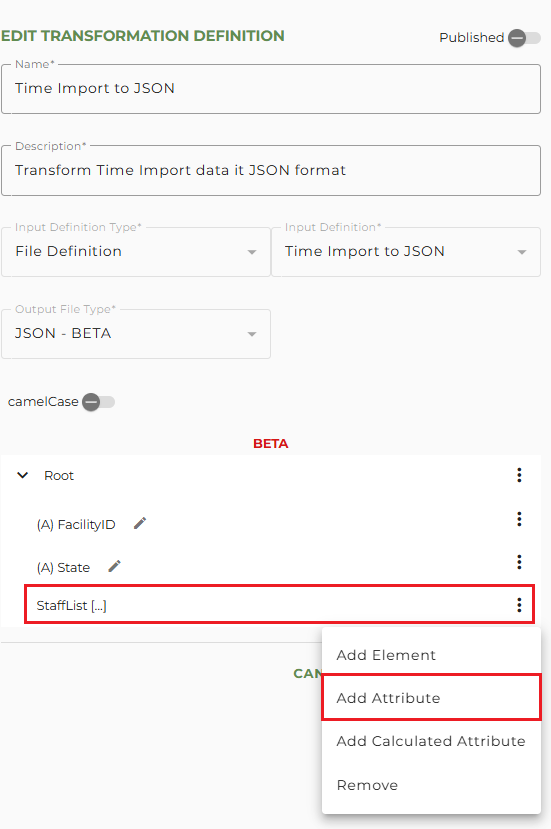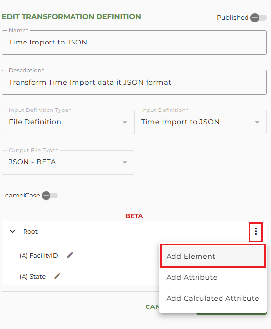 In our JSON format example, we need to create a "FacilityID" and "State" attribute. To add an attribute to the root, click on the vertical dot menu for Root and select Add Attribute.