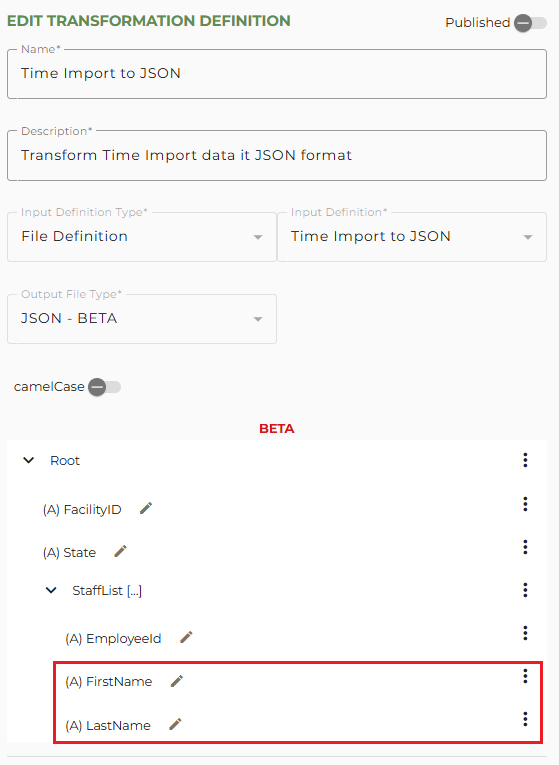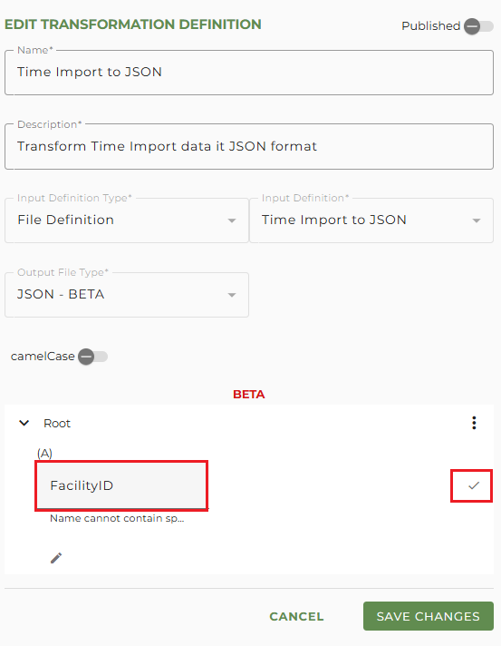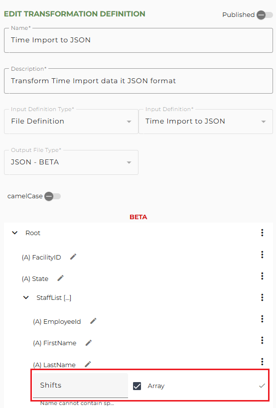 camelCase - Toggle this ON if you want to ensure that the Name values you enter are in camel casing. For example, 'FacilityID' will be changed to 'facilityID' if this is active.
