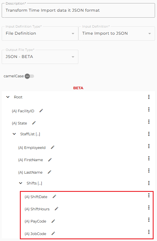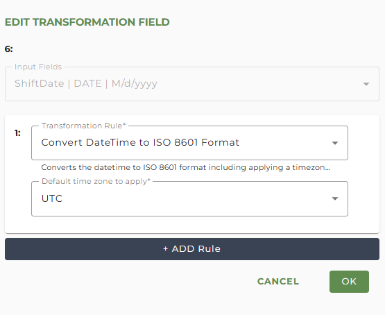 Transformation rules are available when selecting the attribute's Input Fields. For example, we need to change the DateTime format of the ShiftDate to match the desired JSON output. This can be accomplished by creating a new Attribute in the Shifts array element, selecting ShiftDate as the Input Field, and selecting the 'Convert DateTime to ISO 8601 Format' with a UTC time zone.