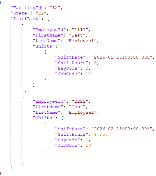 A JSON element (object or array) can also contain another JSON element. In our example, the StaffList element contains an array element for the employee Shifts.