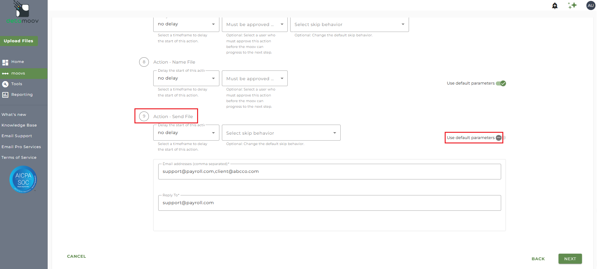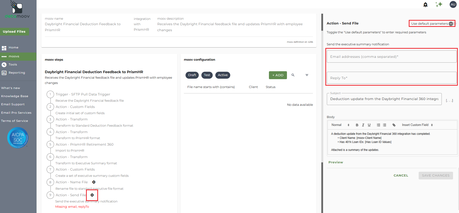 Note: these settings apply to any client configuration you set up for this specific moov. You also have the ability to configure the send file step for each client configuration if you wish to add or remove email addresses per client.