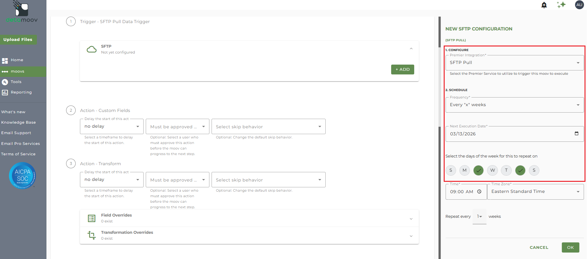 On the New SFTP Configuration section on the right, select the SFTP Pull option from the Premier Integration menu. Then select either "Every X weeks" or "On certain days of the month", depending on how often you would like detamoov to check for new feedback files. We recommend that you check for feedback files at least twice a week. In the example below, we have set up a schedule to check for files twice a week on Tuesday and Friday.