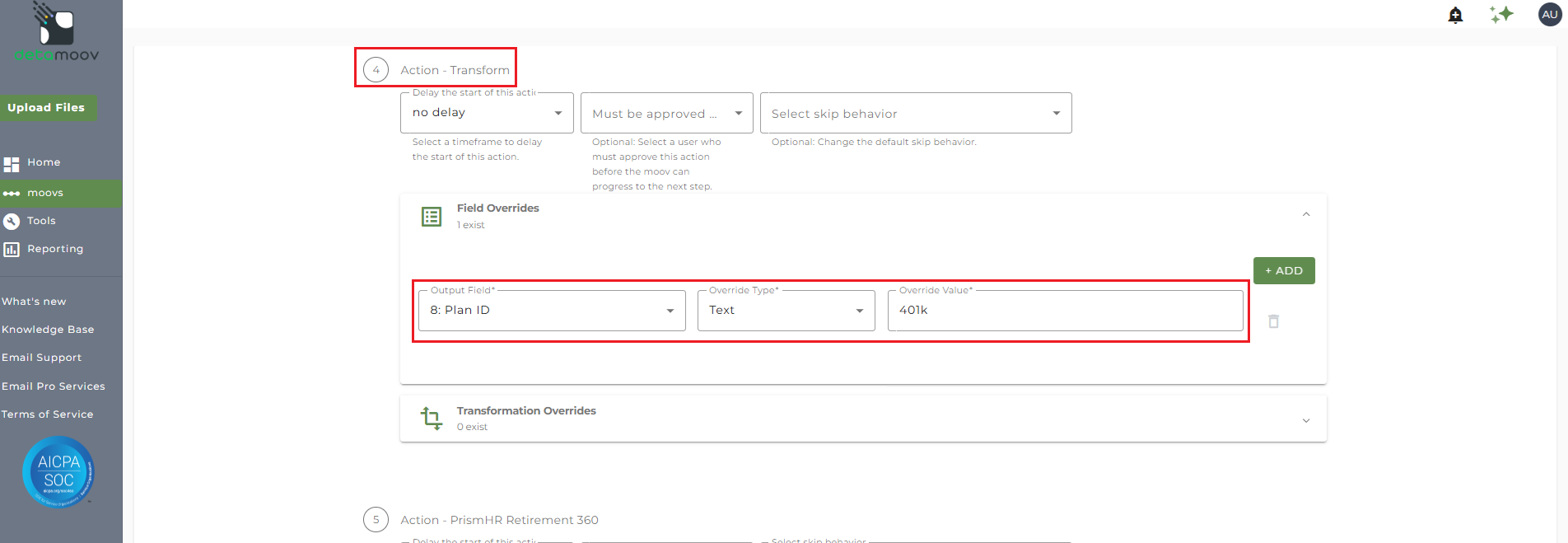 NOTE: There are three separate Transform steps on the Daybright Financial Deduction Feedback to PrismHR moov. Make sure are you creating the field override on step 4: Action - Transform.