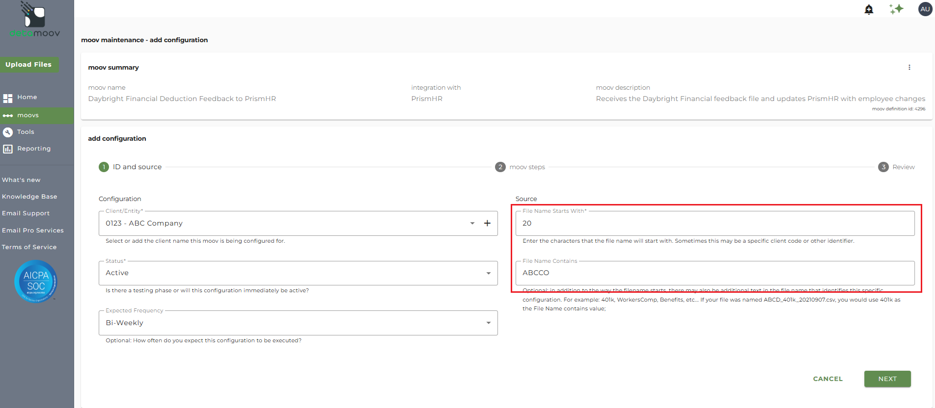 Note: make sure that the File Name Starts With and File Name Contains fields match as this can cause issues pulling the Daybright Financial feedback file and updating PrismHR.