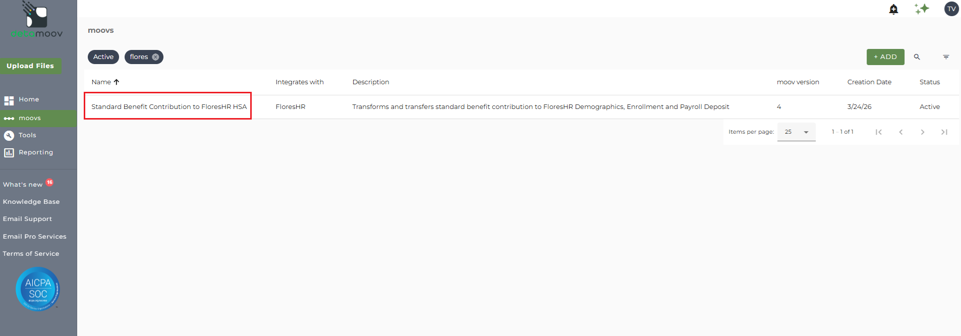 Once the Standard Benefit Contribution to FloresHR HSA moov has been added to your account, access the moovs section on the left side menu and click on the Standard Benefit Contribution to FloresHR HSA moov.