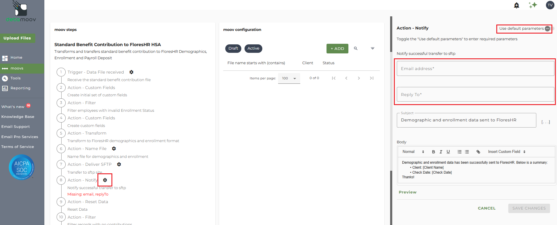 The Standard Benefit Contribution to FloresHR HSA moov provides notifications for when the demographic/enrollment and payroll deposit files have been sent to FloresHR. These notifications can be sent to any email address you wish and can also be configured to send to multiple email addresses.