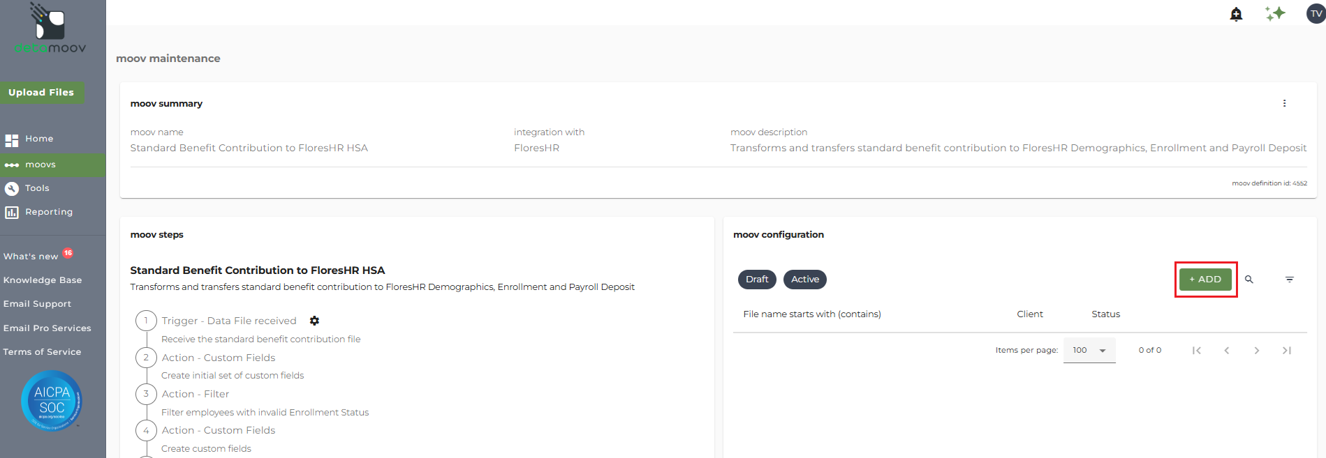In the moov configuration section, click the Add button to add a new client to send HSA demographic, enrollment, and payroll deposit data to FloresHR.