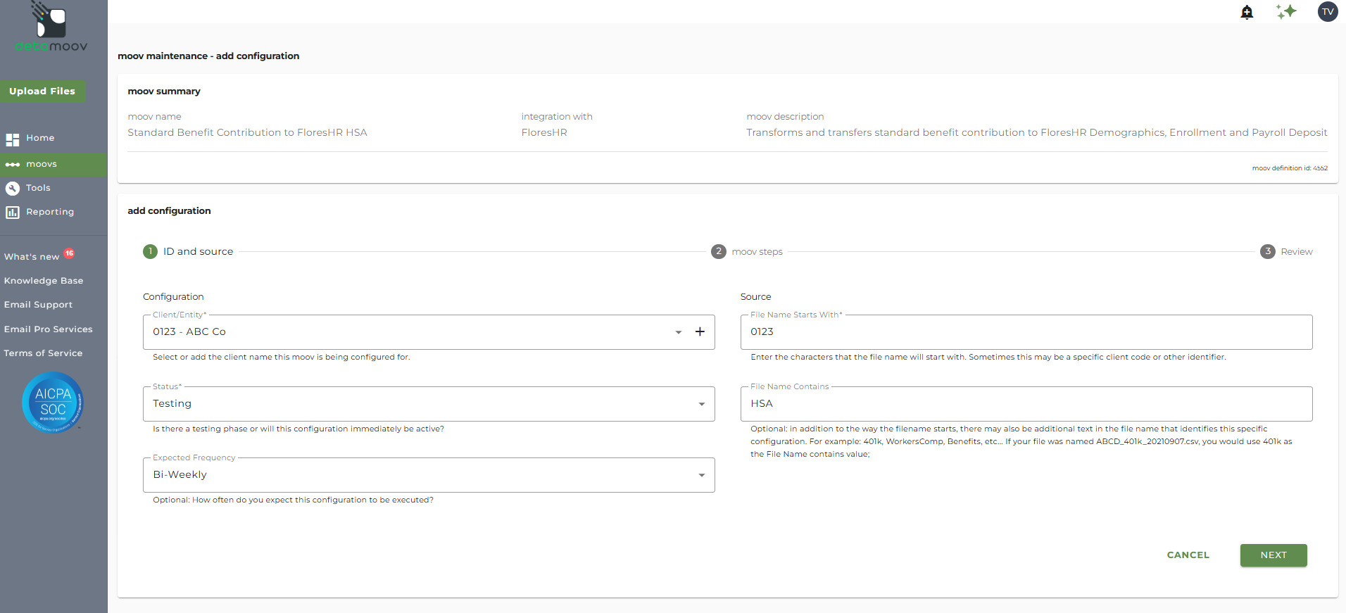 Note: the Standard Benefit Contribution to FloresHR generates two separate files: Demographic/Enrollment and Payroll Deposit. This article will define the configuration needed to send both formats in a single moov.