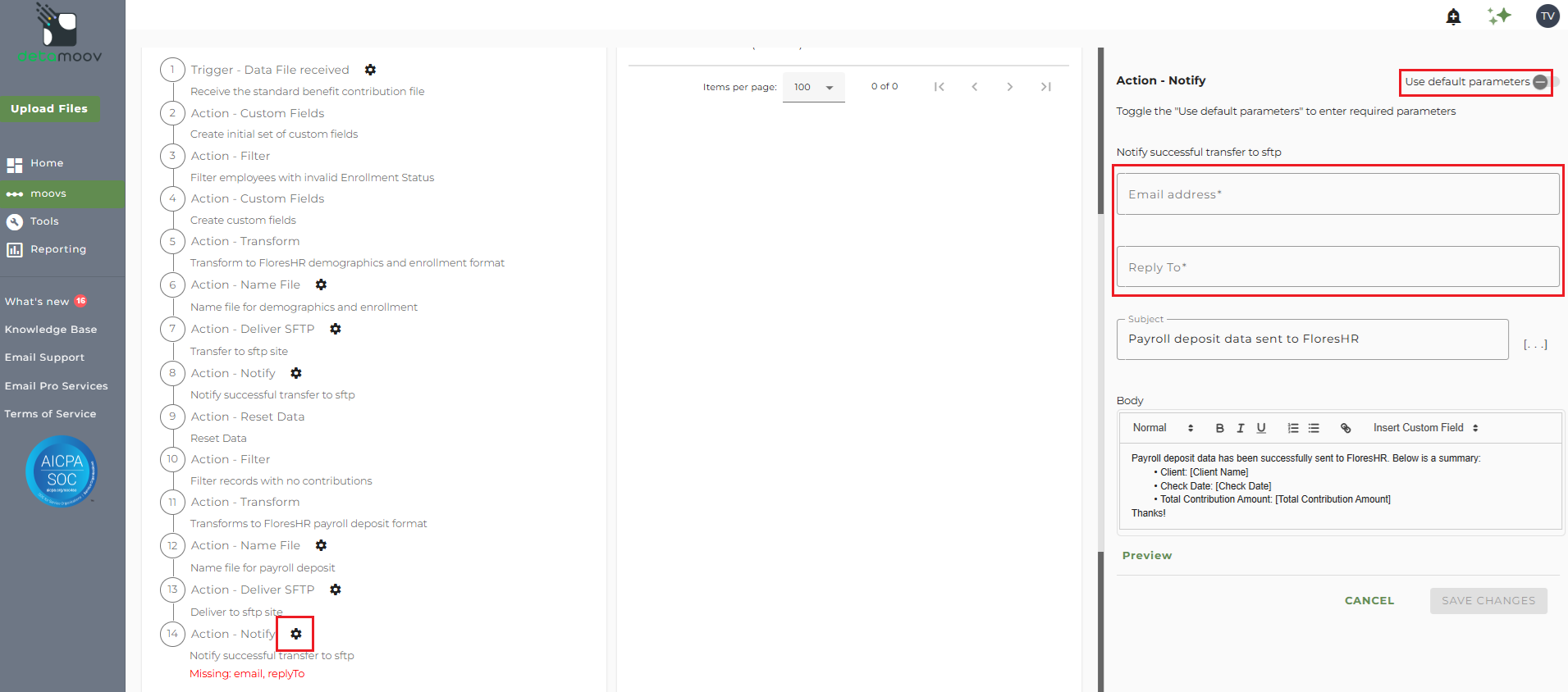 To edit the notification step for payroll deposit, click on the cog icon under step 14: Action - Notify on the left. Then toggle the "Use default parameters" off and enter in the email addresses you would like to receive the notification. If you would like to enter multiple email addresses, separate them with a comma. A Reply to email is also required in the event that a recipient of the notification replies to the email.