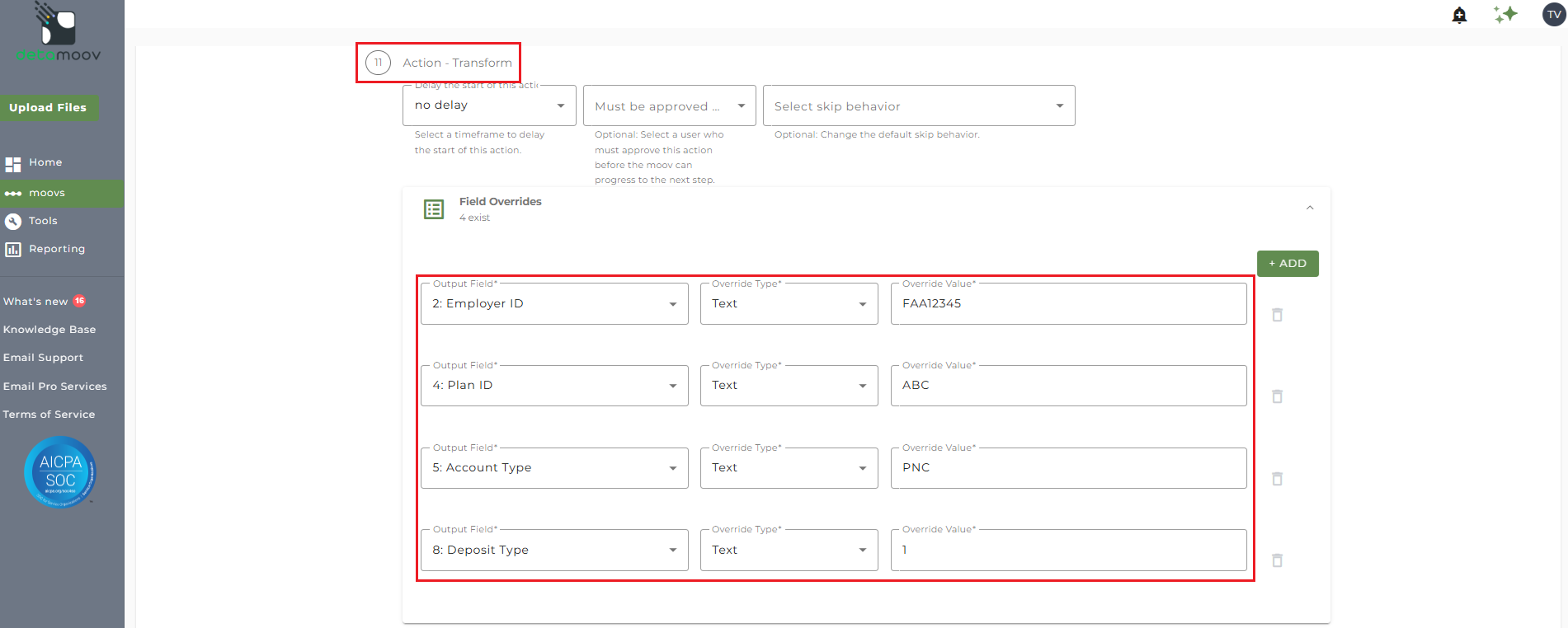 To provide a field override, locate step 11: Action - Transform, click the Field Overrides panel, and click the Add button. Then set the values for the following fields specific to your client's plan: