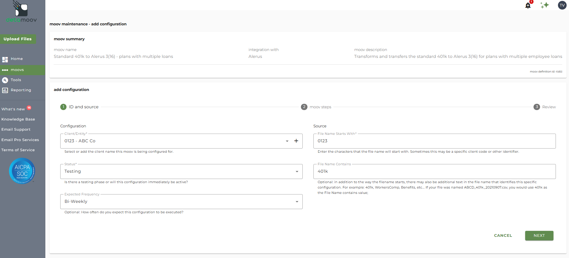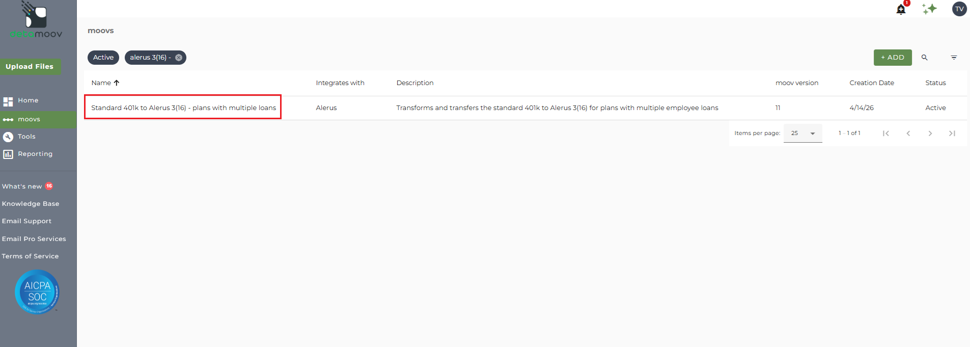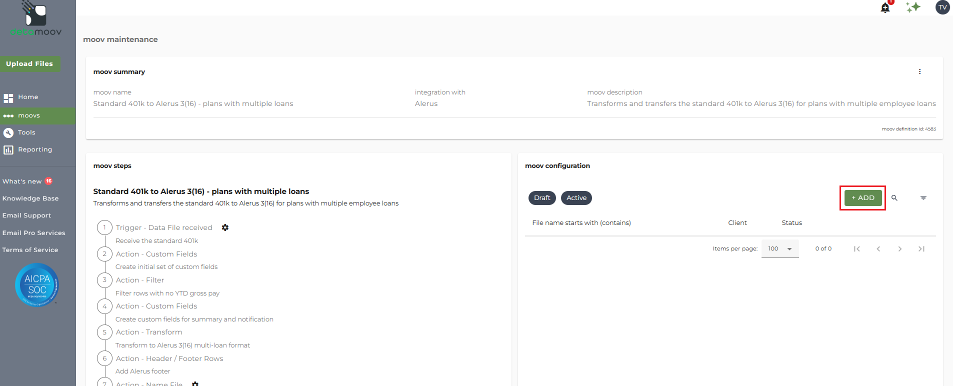 Once the Standard 401k to Alerus 3(16) - plans with multiple loans moov has been added to your account, access the moovs section on the left side menu and click on the Standard 401k to Alerus 3(16) - plans with multiple loans moov.