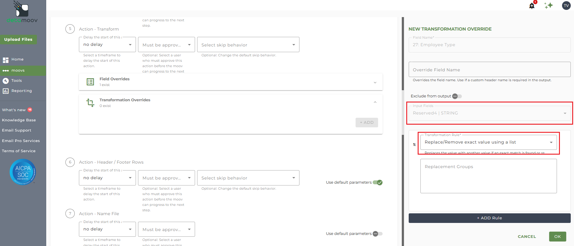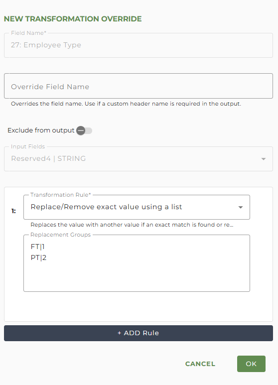 In the Input Field dropdown select the Reserved field where the Employee Type will be passed to detamoov and select the 'Replace/Remove exact value using a list' Transformation Rule.