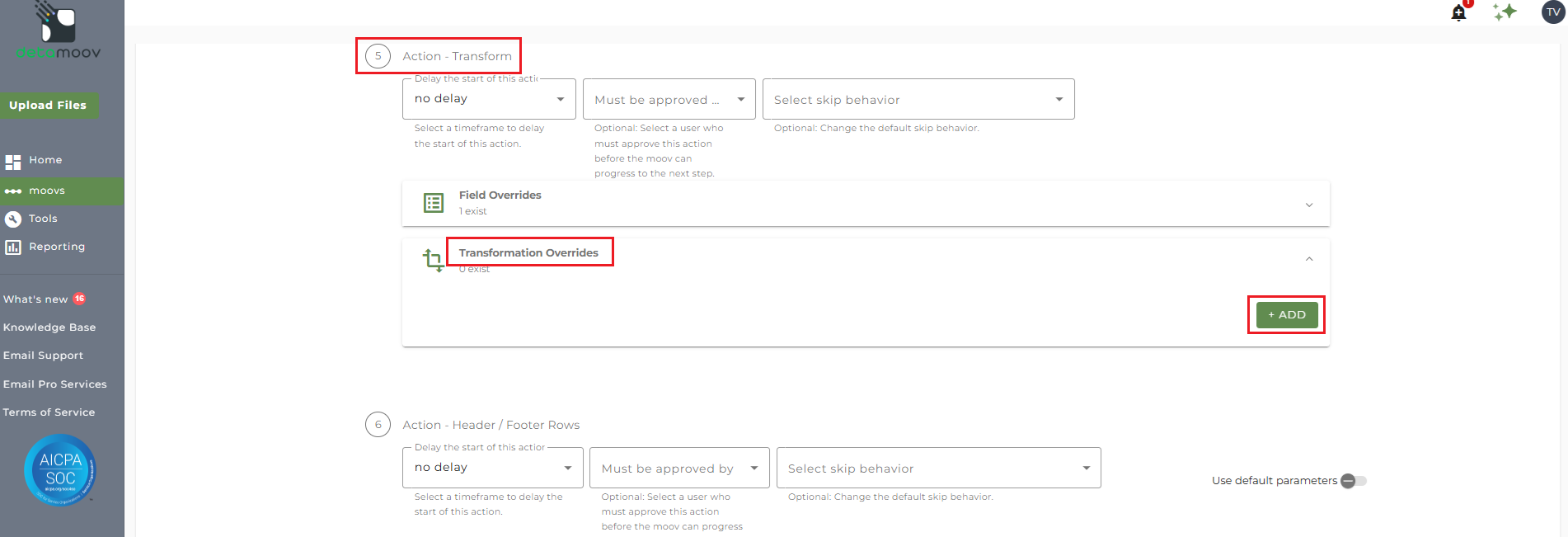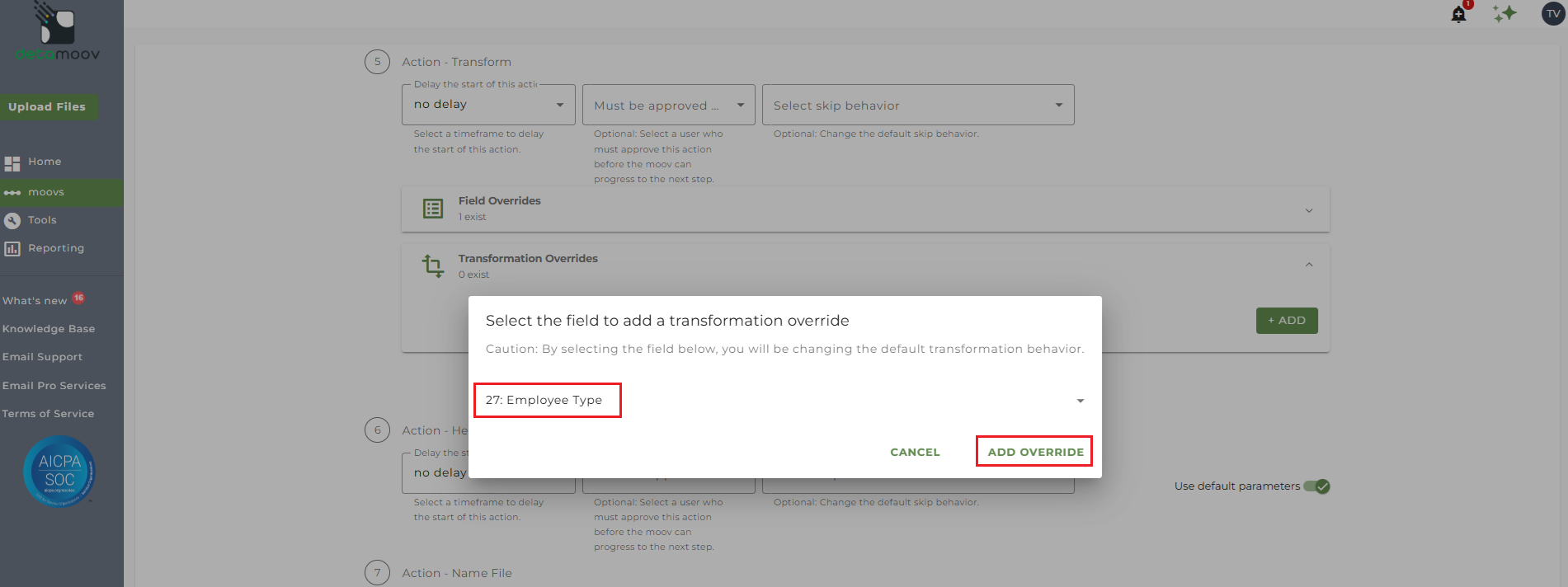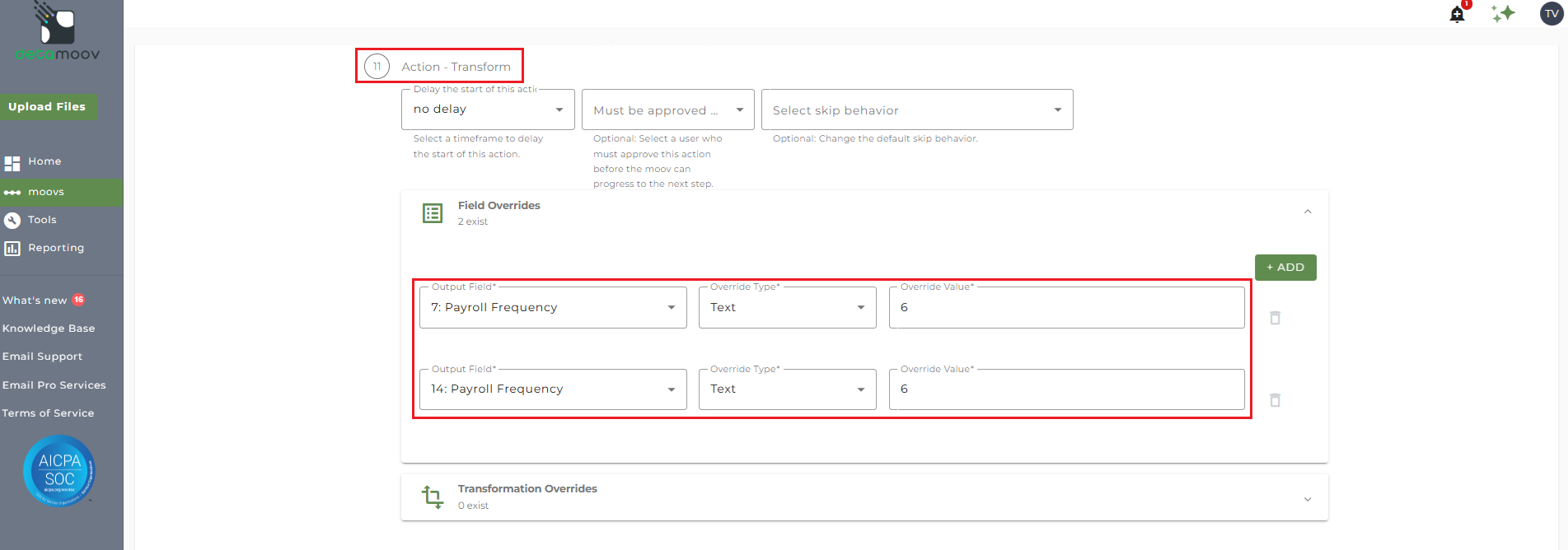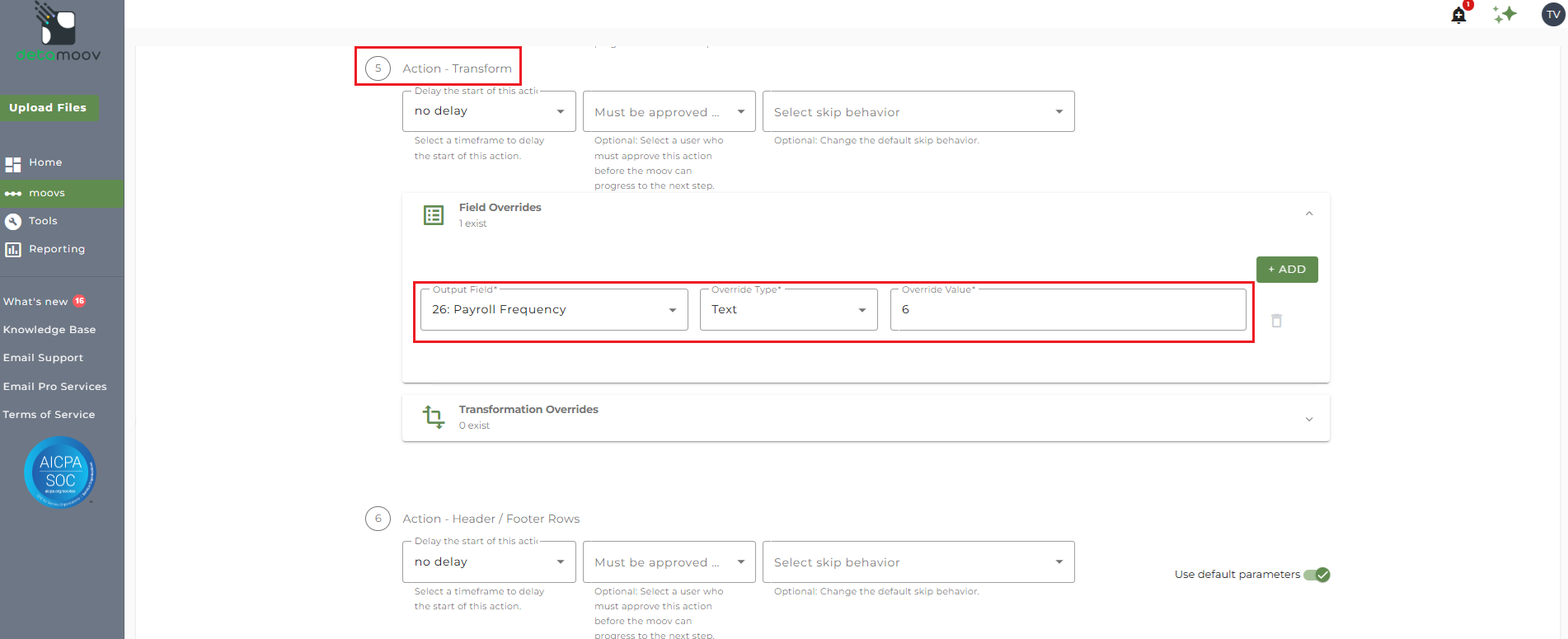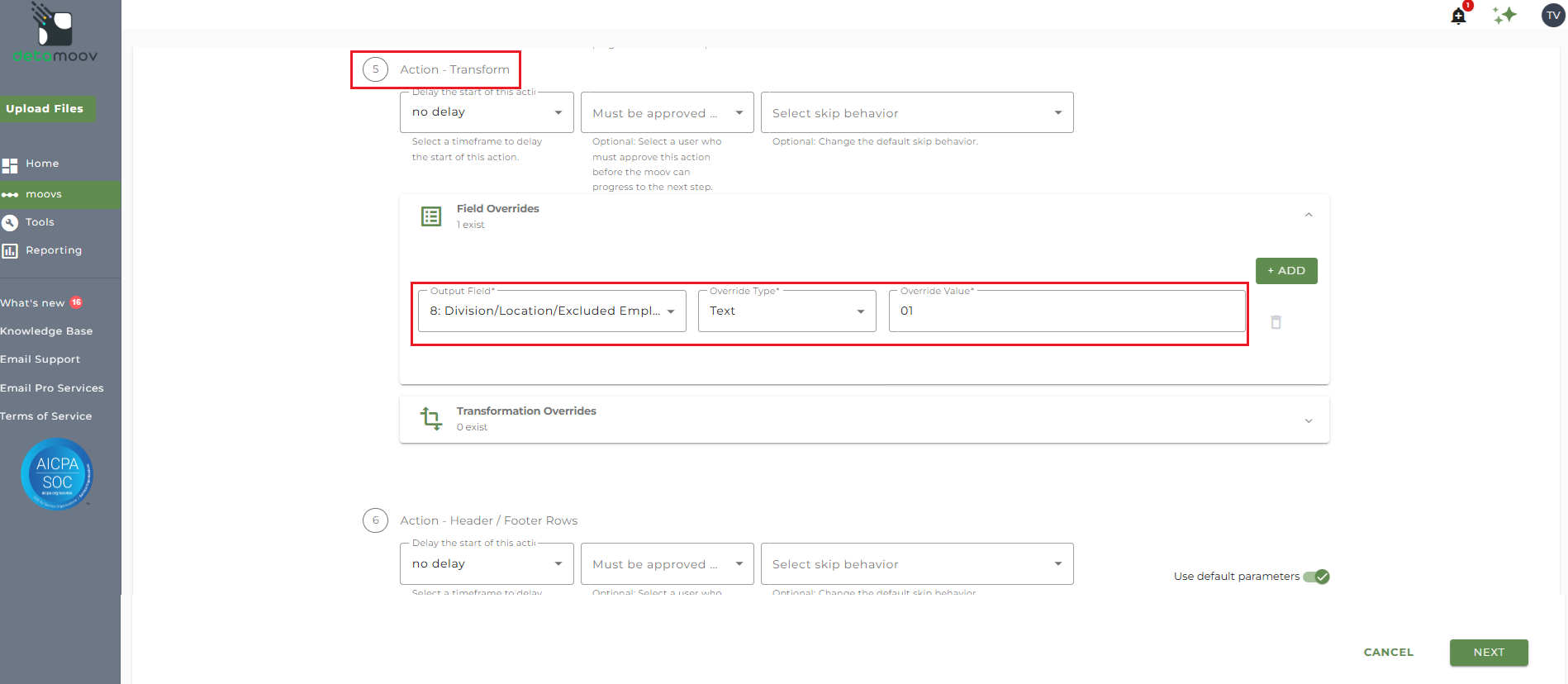 To provide a transformation override to map the employee type in payroll to the Alerus value, locate step 5: Action - Transform , expand the Transformation Overrides panel, and click ADD.