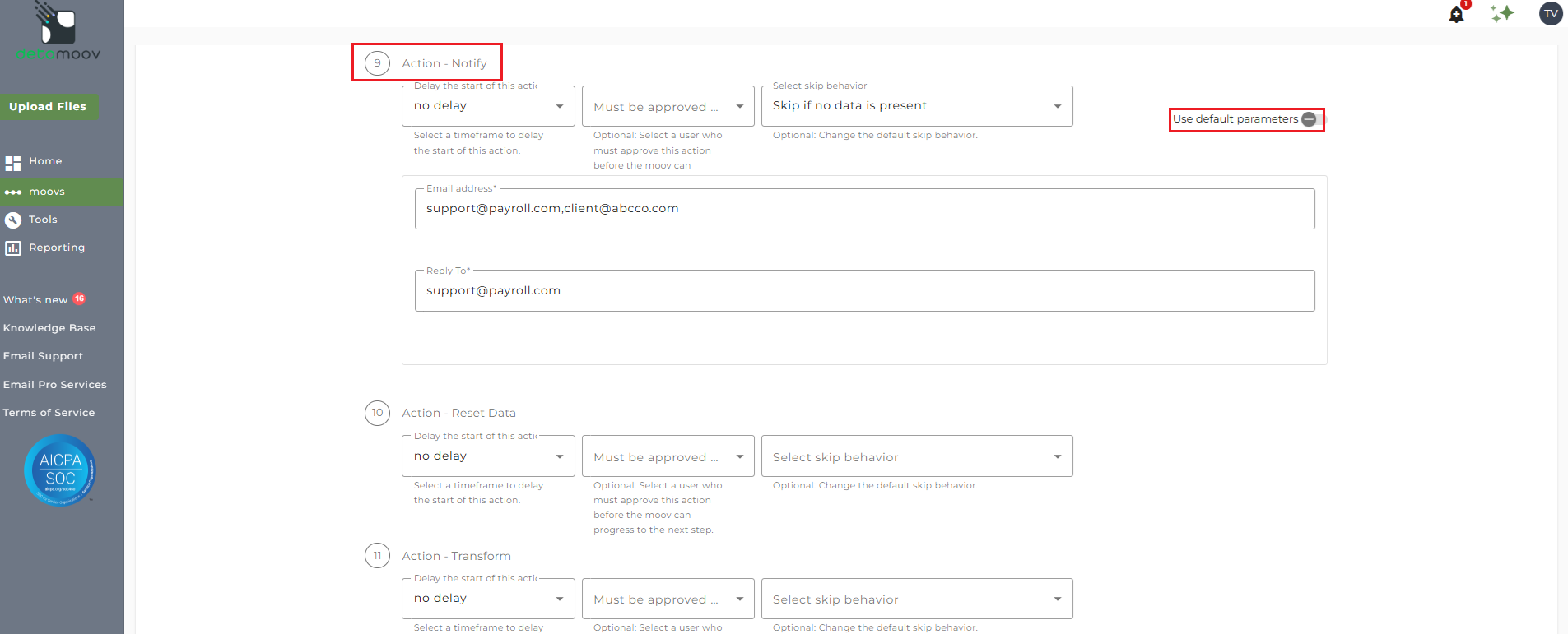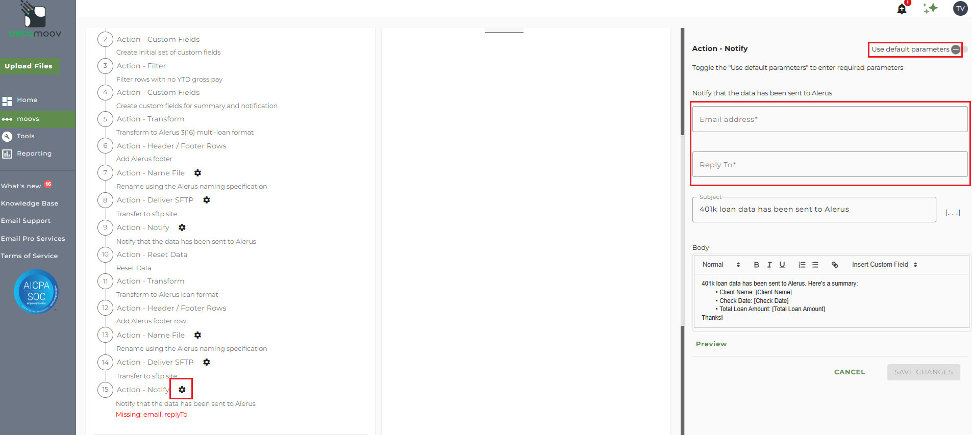 To edit the notification step for loan data, click on the cog icon under step 15: Action - Notify on the left. Then toggle the "Use default parameters" off and enter in the email addresses you would like to receive the notification. If you would like to enter multiple email addresses, separate them with a comma. A Reply to email is also required in the event that a recipient of the notification replies to the email.