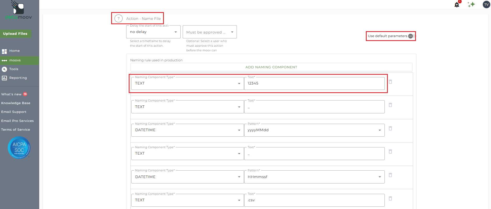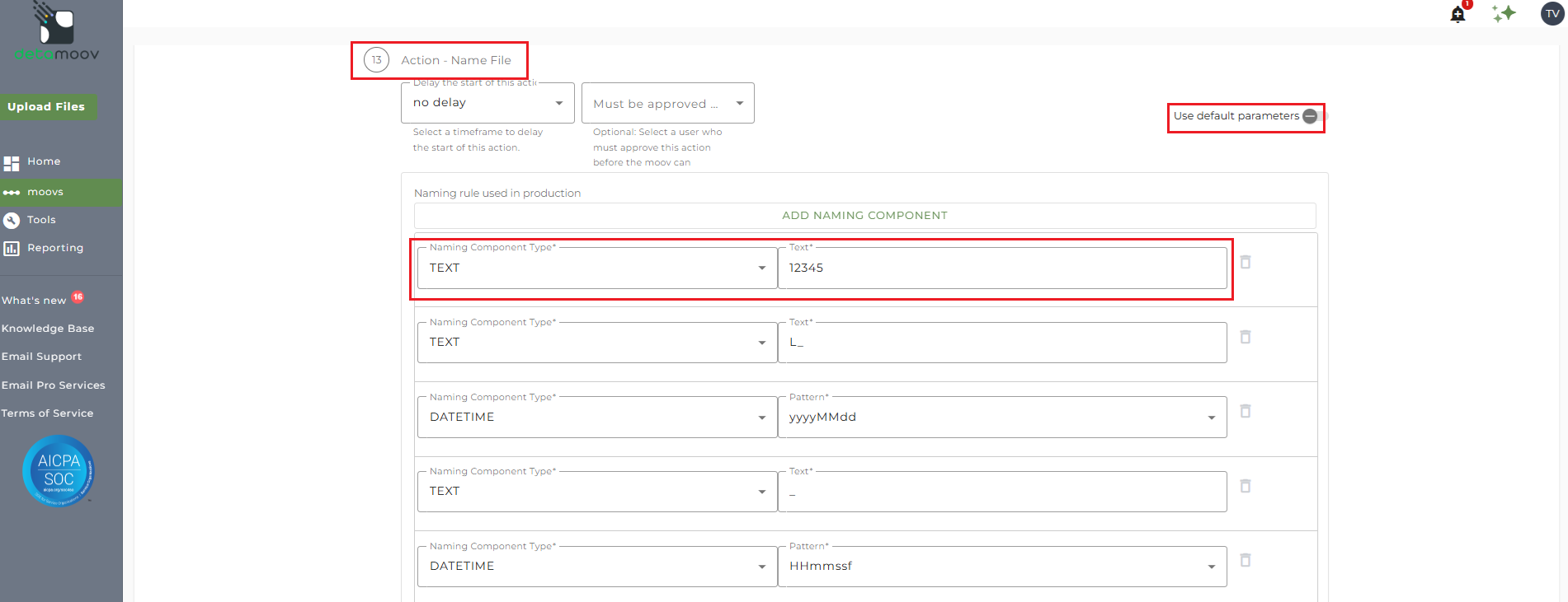 To add a file name override, locate step 7: Action - Name File and toggle the 'Use default parameters' off. Then change the Naming Component Type Custom Field of Plan ID to Text and enter in the Plan ID.
