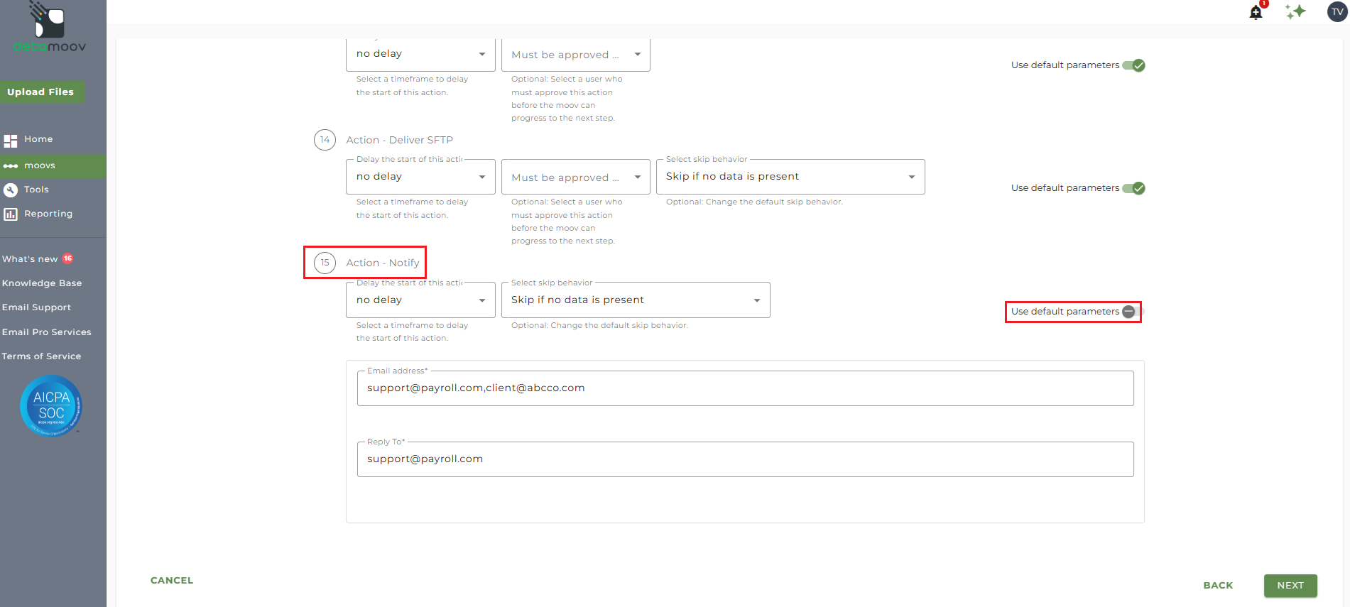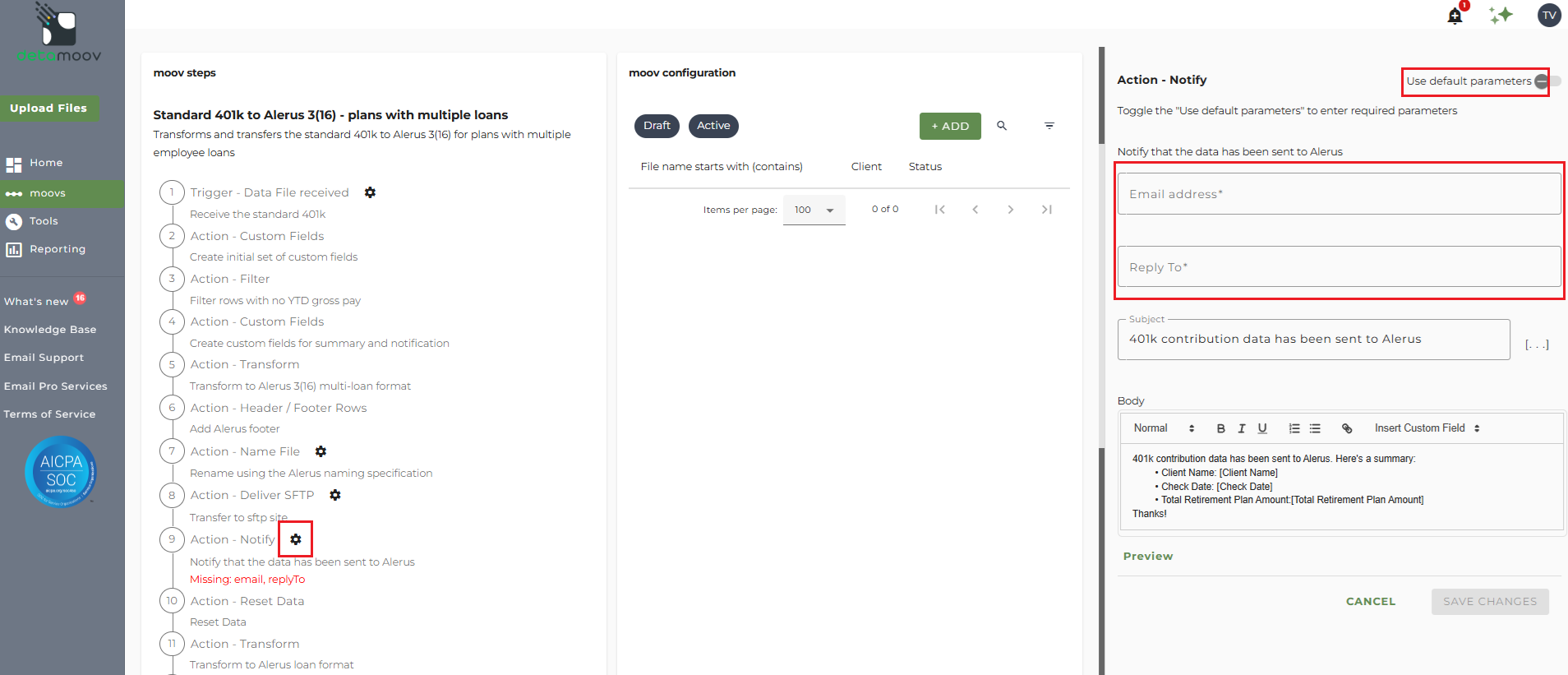 At the beginning of this article you configured the notification step for the moov to send a notification once contribution data has been sent to Alerus. You also have the ability to configure the notification step for each client configuration if you wish to add or remove email addresses per client.