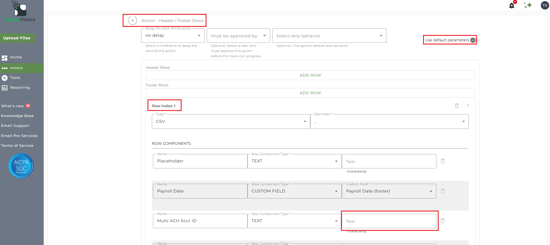 Alerus may require the ACH Account ID be provided in the footer row of the file sent to them. To provide the ACH Account ID, locate step: 6 Action - Header/Footer Rows and click the Row index: 1 to expand the Footer Rows. Then, locate the row component for 'Multi ACH Account ID' and enter in the ACH Account ID in the text field.