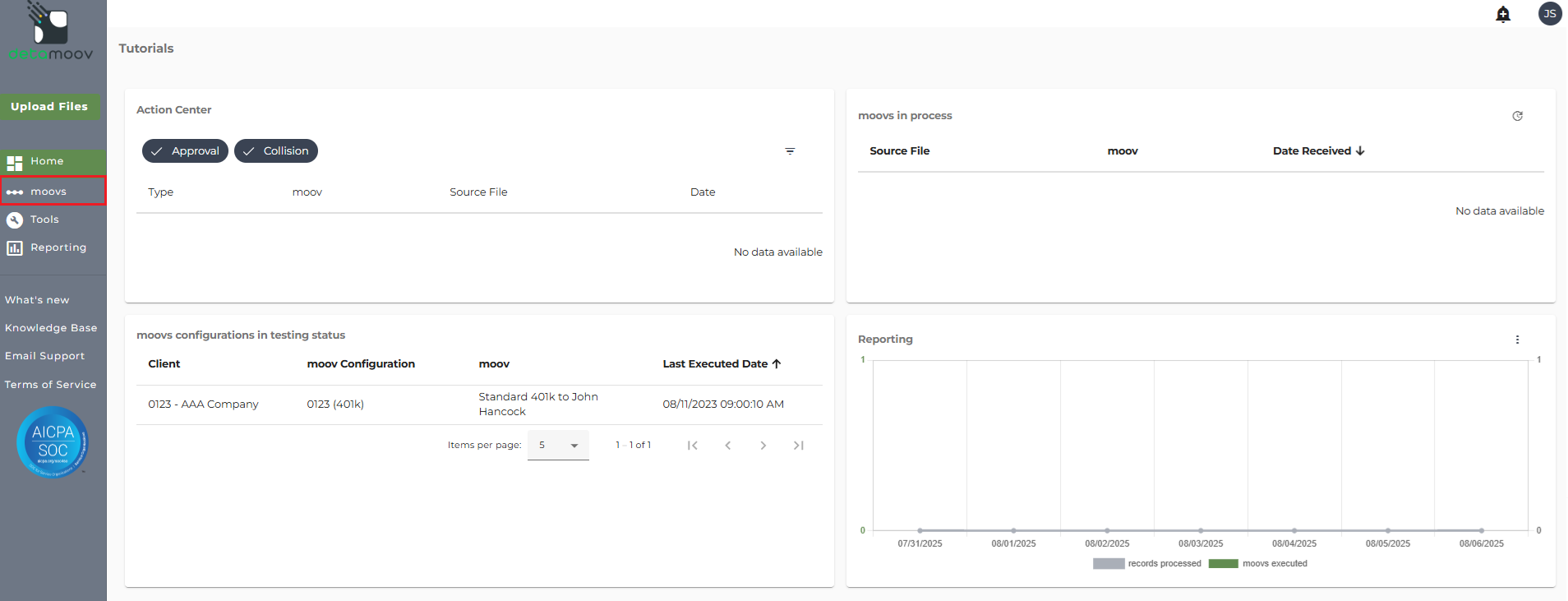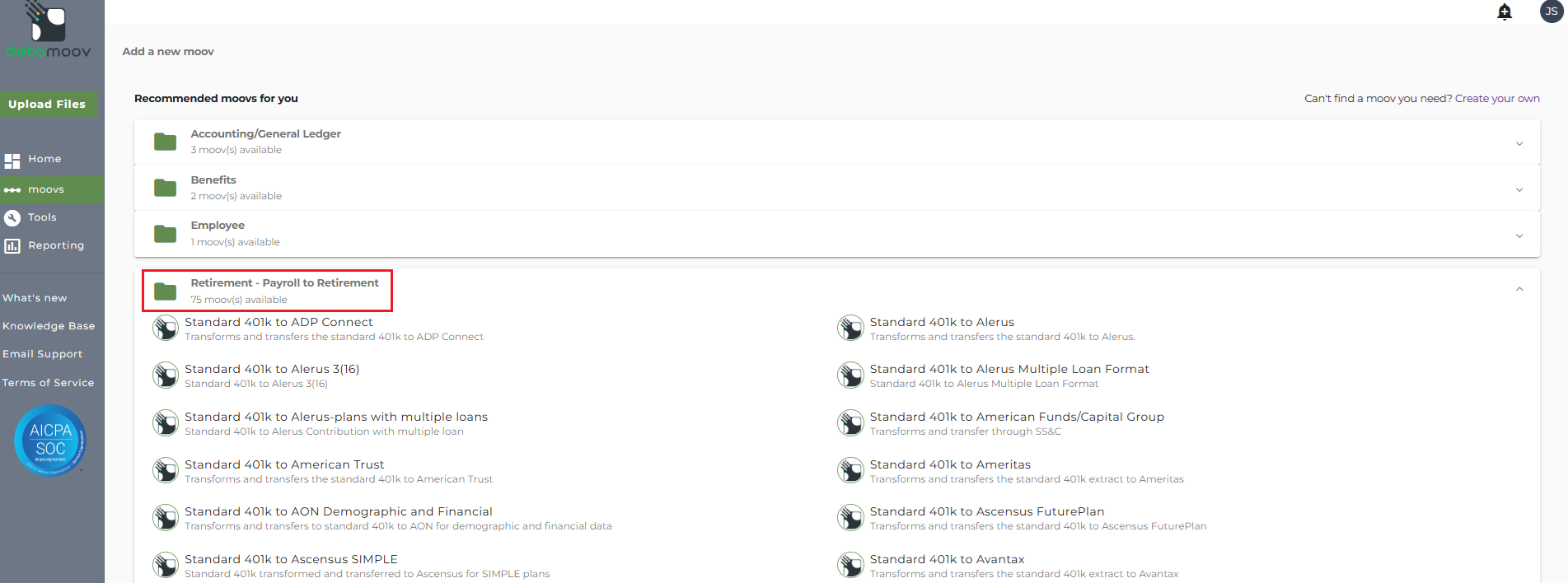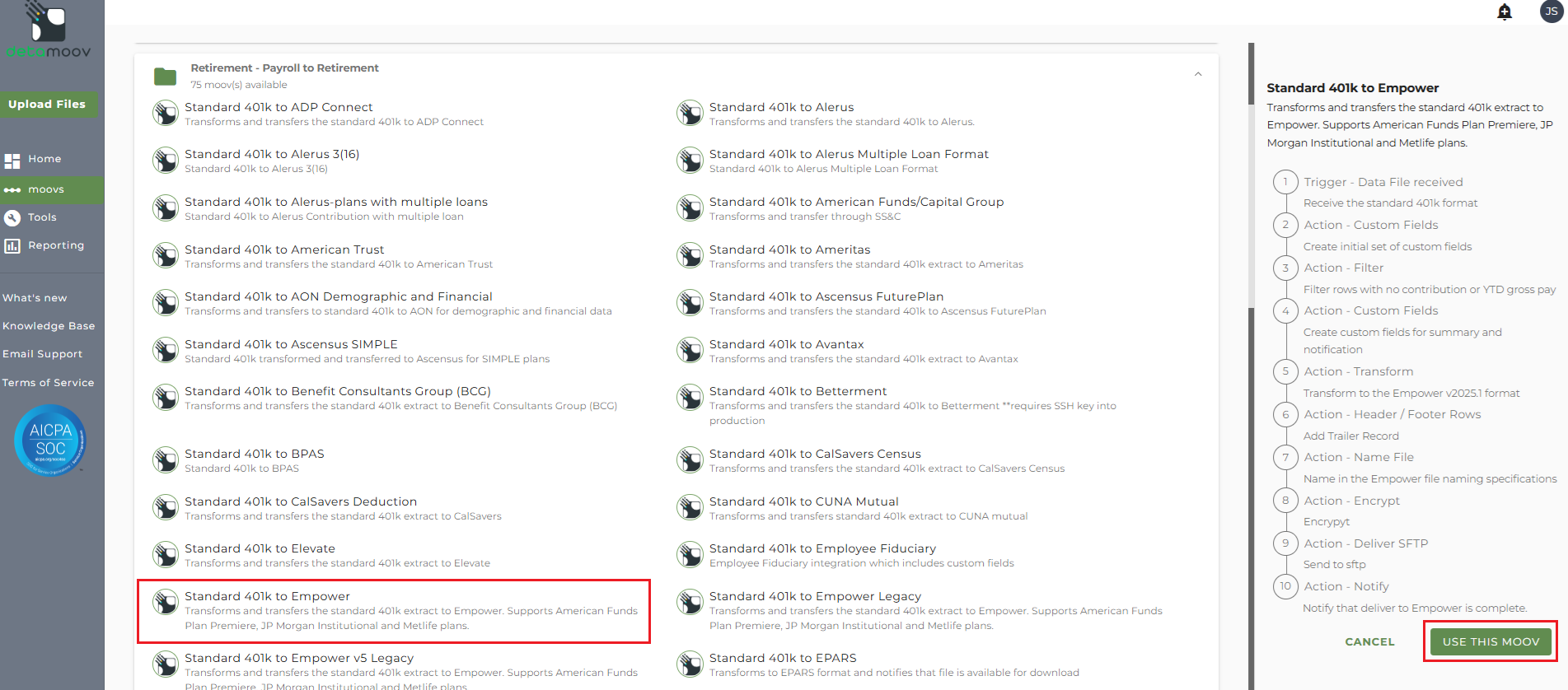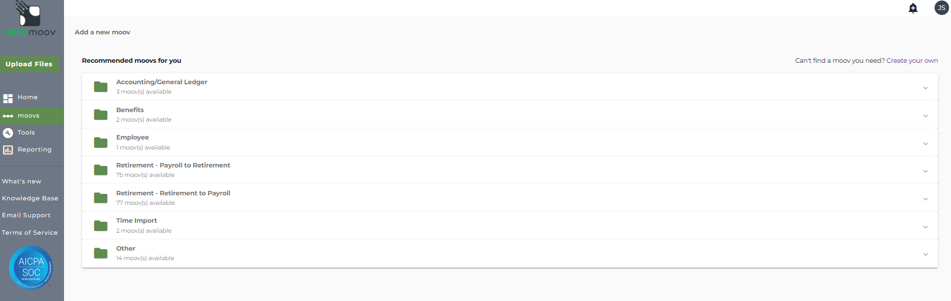NOTE: If your account is set up to allow you to create your own moovs and you don't see a moov that fits your needs, click on the 'Create your own' link at the top. If you don't see this option and would like to create your own moovs, please Contact Us.