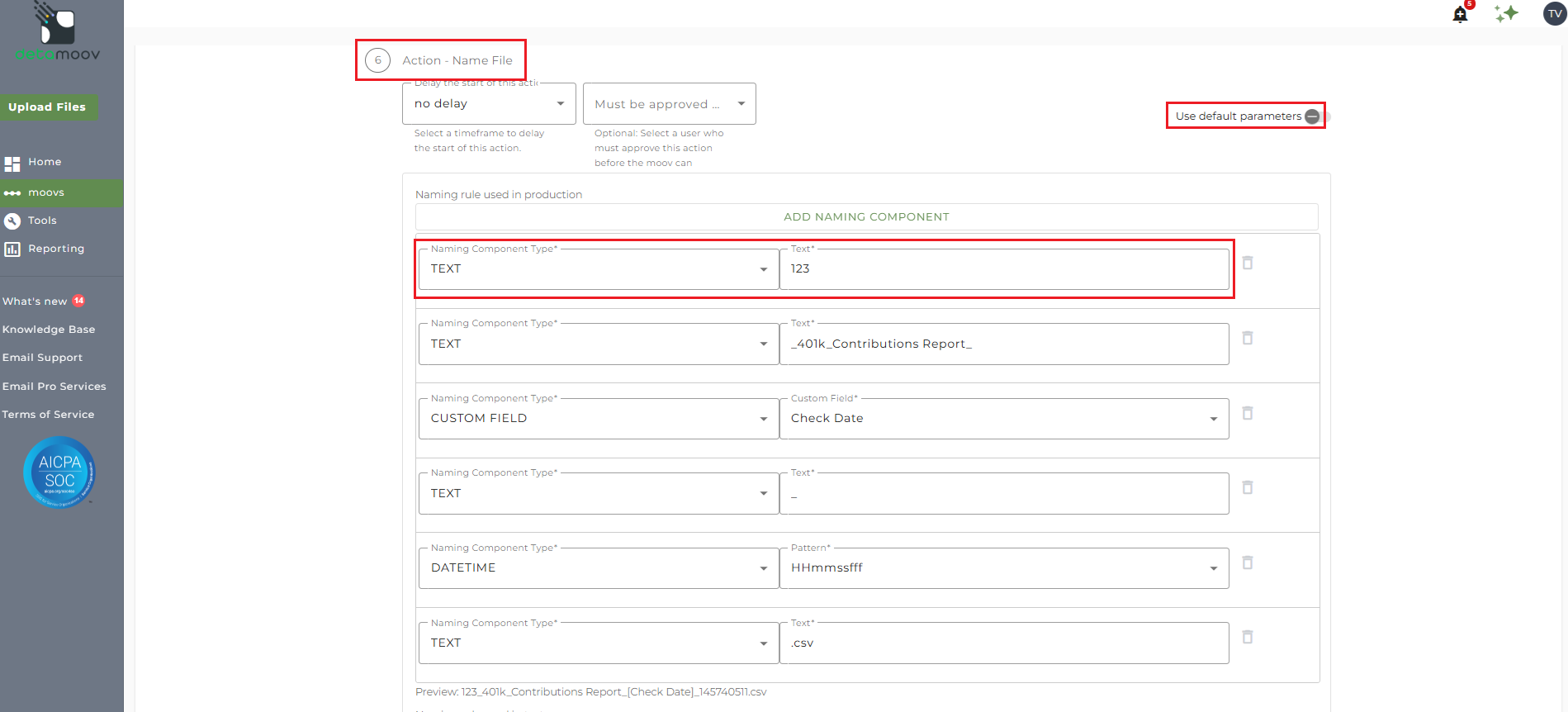 To override the Name File step, locate the Action - Notify step and toggle the "Use default parameters" off. Change the Naming Component for "Company Code" to Text and input your client's Company Code.