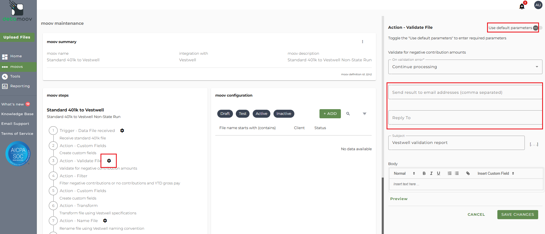 Vestwell non-state run plans cannot have a negative contribution amounts. If the standard 401k file received contains negative Roth or Pre-Tax amounts, you will be notified and they will then be filtered out of the file sent to Vestwell. To ensure that you receive the notification, click on the cog icon under the Action - Validate File step on the left. Then toggle the "Use default parameters" off and enter in the email addresses you would like to receive the notification. If you would like to enter multiple email addresses, separate them with a comma. A Reply to email is also required in the event that a recipient of the notification replies to the email.